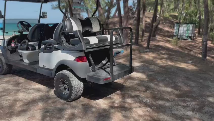 We offer a variety of golf carts to suit your needs, including 4-passenger, and 6-passenger carts. All our carts are gas-powered and equipped with tops for shade; however, please note that the tops do not cover the back seats.